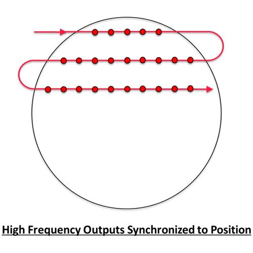 High-resolution inspection, metrology, patterning, and printing applications rely on the motion control system to accurately trigger devices, including cameras, inspection heads, and lasers at high speed. ACS drive and drive interface products provide this capability via Position Event Generation (PEG). Flexible operating modes are supported, including incremental fixed distance pulsing, array-based random distance pulsing, and array-based random distance gating.